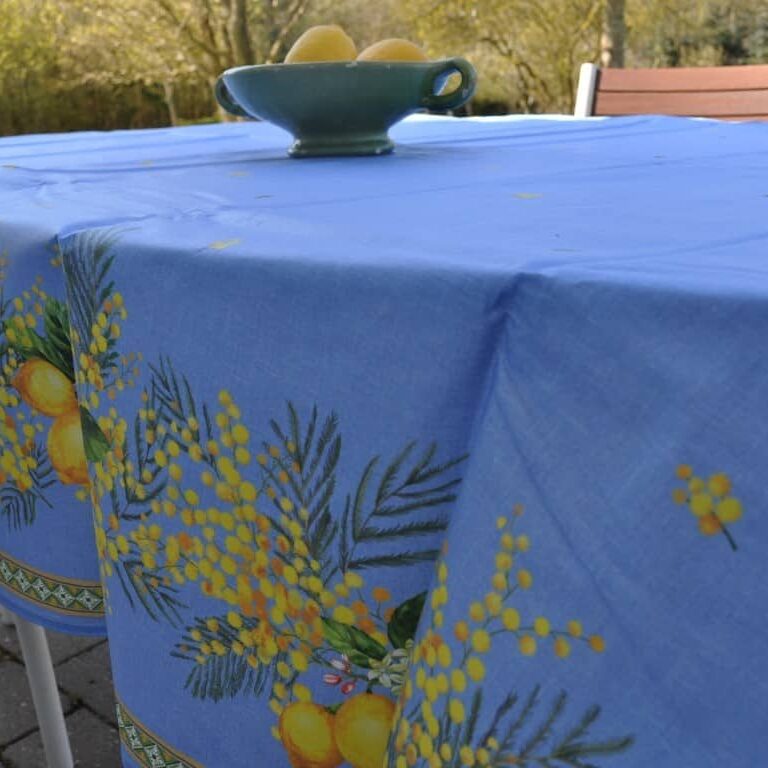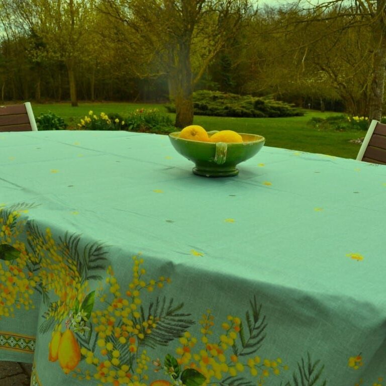 Smukke og farverige provenceduge i god kvalitet. Dugene findes i 2 flotte farver og med motiver af citron og mimose. Skønne gule farver fylder dugen langs kanten og afsluttes med en friselignende kant/bånd med mønster i grønne farver. En dug til haven eller boligen. Fantastiske farver som minder os om sommer, sol, forår, ferie, hygge og meget andet. Den grønne farve har været svær at gengive på billederne.